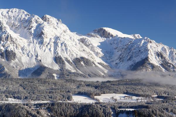 | Jenseits (nördlich) der Enns erheben sich über dem Ramsauer Plateau viele namhafte, ganzjährig interessante Wandergipfel, wie beispielsweise der Sinabell nordöstlich vom Gutenberghaus, welches oberhalb der Bildmitte als winziges Pünktchen zu erkennen ist. |