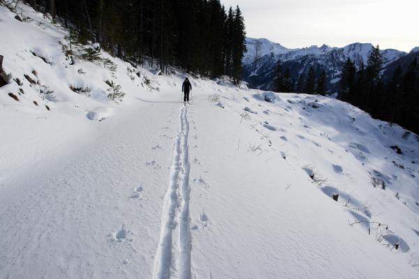 Menschenspuren / Schispuren im Schnee. Soweit die Steigung ausreicht, lässt es sich auf wenigen Zentimetern Pulverschnee gemütlich bis zum Winterwanderweg abgleiten. Es sind aber auch längere Gerade bzw. sogar leicht Gegensteigungen dabei.
