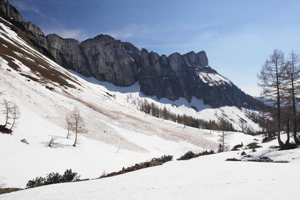 Immer wieder kullern Steine und kleinere Nassschneelawinen über die Steilhänge zwischen Bräuningalm und Loser herunter.