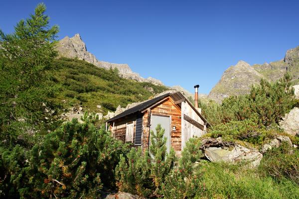 Im Umfeld einiger felsiger Stellen quert ein ansatzweise erkennbares Steiglein norwärts und bald erreichen wir eine kleine Jagdhütte ...