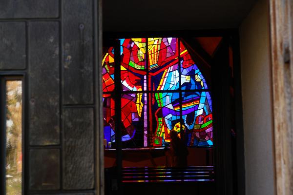 ... mit ihrem farbenprächtigen Fenster nicht fehlen.