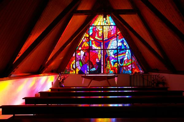 Die Sonne durchdringt die bunten Glasscheiben und flutet das Innere der Kapelle mit herrlichem Farbenspiel.