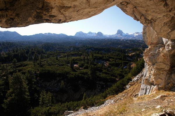 | Bei der Jause schweift mein Blick über das weite Waldgebiet und ausgedehnte Latschenfelder im Süden, welches ich auch bereits einmal bei einer Schitour vom Hirzberg über Napfenkogel und Kufstein zum Stoderzinken durchwandert habe. Den Blickfang bilden natürlich im Südwesten die höchsten und markantesten der Dachsteingipfel. Der Hohe Dachstein kann sich gegenüber dem mächtigen Großen Koppenkarstein dabei aber gar nicht so richtig in Szene setzen. Da der rundliche Gjaidstein oder Gjoadstoa, wie ihn die Einheimischen nennen, dort die schneebedeckten Gipfel von Eselstein und Scheichenspitze. Davor der Landfriedstein. |
