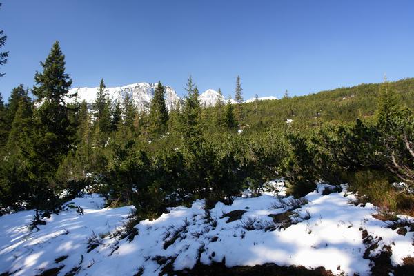Gemächlich führt die Forststraße nach oben. Nach einem grünen Latschengürtel ...