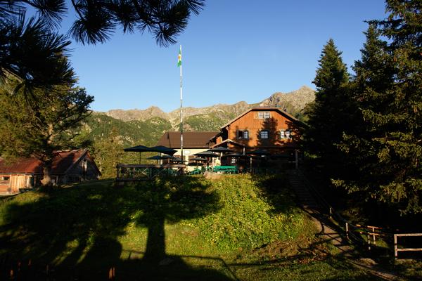 Nach wenigen Minuten ist die Edelrautehütte erreicht. Im Hintergrund erkenne ich den Bösenstein.