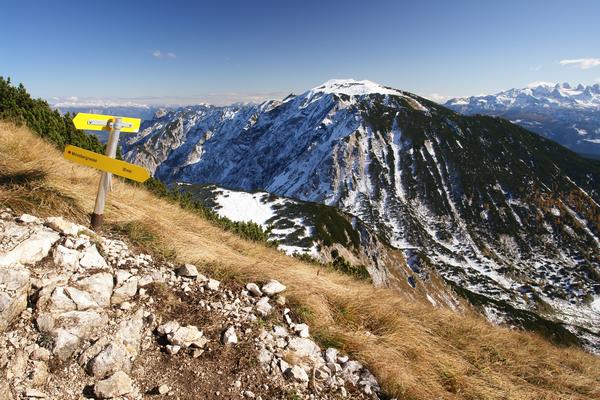 Im Osten das Gamsfeld, davor der latschenbewachsene Schmalztrager (beide Gipfel waren Tourenziele einer Schneeschuhwanderung am 19.04.2009).
