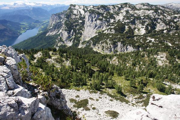 Unter uns das Gebiet, welches wir zuvor zwischen Widderkar und Aibl durchwandert haben, dahinter erheben sich die steilen Felswände ...