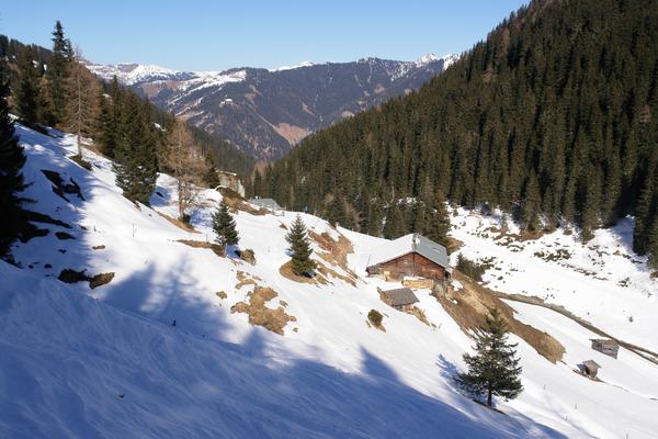 Zerfahren, von gefroren hart über eisig bis aper und mit etlichen Schneehügeln und Mulden versehen, verlangte dieser Wald-Abschnitt volle Konzentration und ganzen Einsatz und so waren wir froh, als wir bei der Oberharbachalm ankamen.