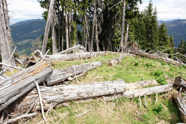 Über Wildsteige und durch Windwurfgebiet erreichten wir entlang eines Bergrückens weiter unten wieder ein gutes Jagdsteiglein ...