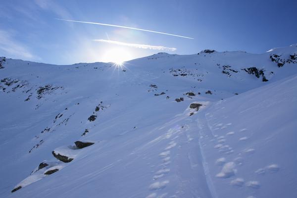 ... ehe ich die Harscheisen für den letzten Steilhang anlege.Mehr als 200 Höhenmeter geht es jetzt steil bergan.