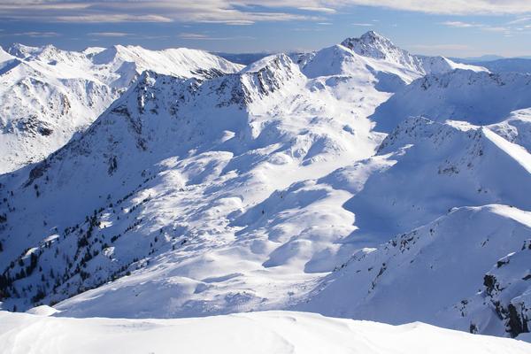 Im Südwesten: Alker (Überschreitung am 22.10.2008) und Talkenschrein (Schitour am 06.04.2007). Dahinter die Schoberspitze (Wandertour am 02.09.2006).