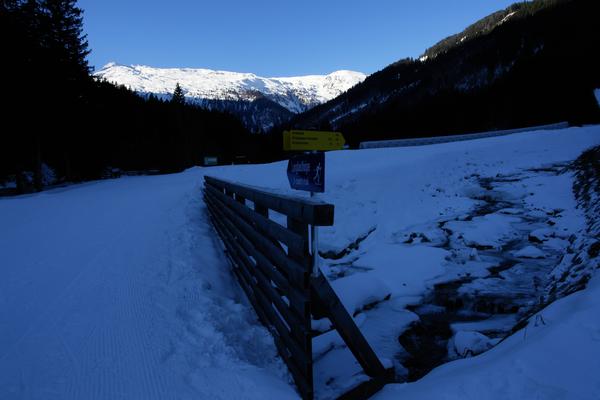 | Im Hintergrund leuchtet das hügelige Hochplateau zwischen Silberpfennig und Kalkbretterkopf bereits gleißend weiß in der Morgensonne. Die "normale" Schiroute würde nach Überschreitung des Lafenbaches nach rechts in den Wald hinauf führen. |