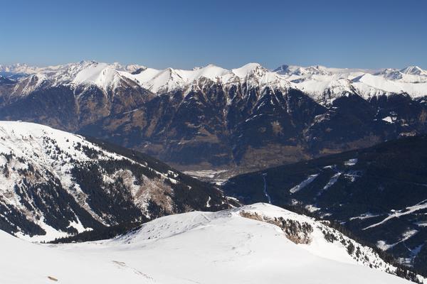 Blick über das Gasteinertal auf die im unteren Bereich schon ausgeaperten Gipfel der Ankogelgruppe.