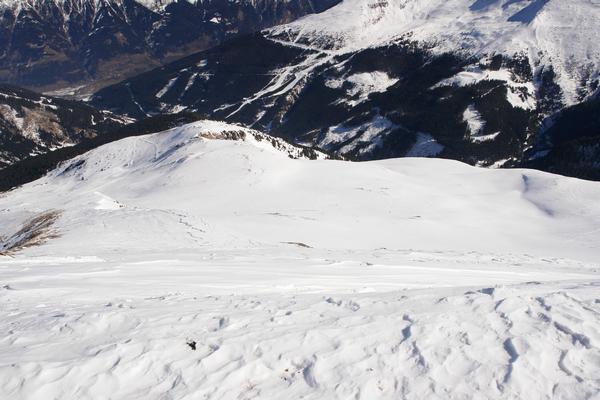 | ... wo ich immer wieder Schitourengeher erkennen kann. Einige im Aufstieg und die zwei, die bei meiner Ankunft am Gipfel kurz nacheinander abgefahren sind, bei der Abfahrt. Einer von ihnen sollte weiter unten ein Schneebrett auslösen. |