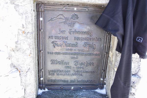 Kurzer Zwischenstopp bei der Steinsäule im Schwalbenkar, wo ein Schitourengeherpaar gerade die hier herunten wieder angenehm warme Wintersonne genießt.