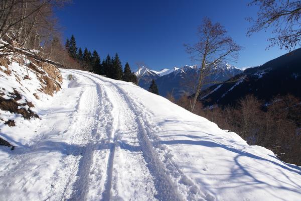 ... ein Forstweg in einer scharfen 180-Grad-Kehre in den Karteisenwald hinauf. Zunächst gibt es noch eine Traktorspur auf der nicht allzu üppigen Schneedecke. Diese zweigt aber weiter oben nach links weg.