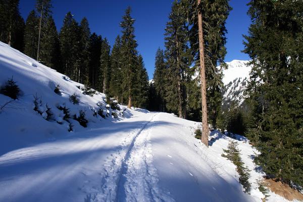 Entlang einer Schispur geht es weiter und bei einer Höhe von etwa 1.500 Meter treffe ich wieder auf die "normale" Schiroute, die hier aus dem Wald auf den Forstweg herauf kommt.