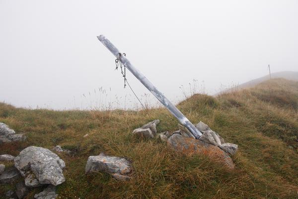 Die kurz zuvor noch so schöne Aussicht über die Nebelschwaden unter mir hat sich allmählich wieder zu einer grauen Nebelsuppe bei mir gewandelt, so dass ich am Gruber Hirnkogel nicht allzu viel sehe.