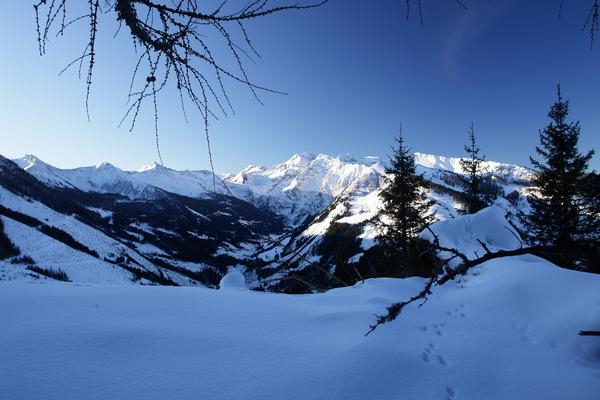Blick in das hintere Sattental. Links Spateck, Schusterstuhl und Säuleck. Oberhalb der Bildmitte die Hochwildstelle.