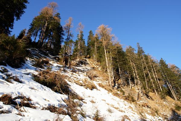 Dort wo die Sonne in den Wald hinein kommt, ist die Schneedecke in tieferen Lagen nur mehr sehr bescheiden.
