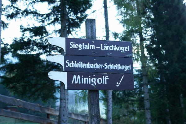 Von der Kirche in St. Johann am Tauern geht es beim Kirchenwirt vorbei zur nahen Volksschule, wo mich die mit Schleifkogel bzw. Lärchkogel beschriebenen Wegweiser Richtung Osten leiten.