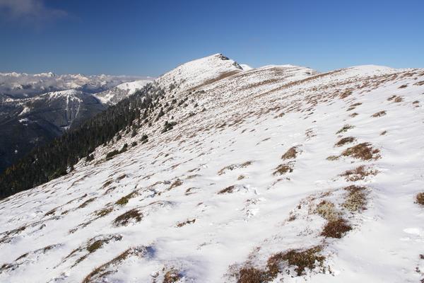 Nordwestlich vom Schleifeck erreiche ich den breiten Bergrücken und auf diesem geht es westwärts zum Gipfelkreuz am Schleifkogel (2.063).