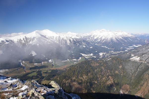 Blick über den Talgraben zwischen St. Johann am Tauern und Hohentauern in die Rottenmanner und Wölzer Tauern. Links der Bruderkogel, rechts die Bösensteingruppe (zuletzt im heurigen Sommer überschritten).