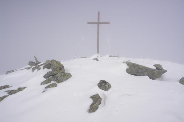 Die Sichtweite beträgt am Gipfel nur wenige Meter, so dass ich das Gipfelkreuz erst wahrnehme, als ich schon fast davorstehe.