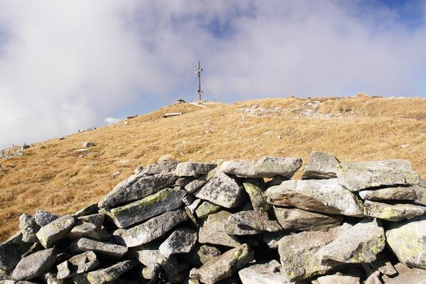 Über einen einfachen Grataufschwung erreiche ich das Gipfelkreuz am Seckauer Zinken, wo ich hinter einem im Halbkreis errichteten Steinwall Schutz vor dem kalten Wind suche.