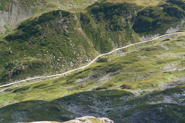 Der Tiefblick nach Osten zeigt etliche Wanderer, die Ameisen gleich, Richtung Giglachseen aufsteigen.