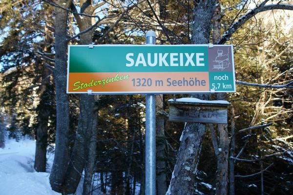 Nach der "Rechtschreibreform": Saukeixe - Vergleiche dazu auch die alte Schreibweise am mittlerweile vergilbenden Holzwegweiser: Saukaeixe.