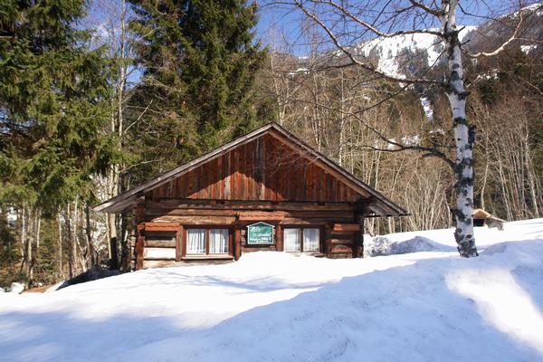 Vorbei an einer Hütte, die auch jetzt - Mitte März - noch reichlich von Schnee umgeben ist.