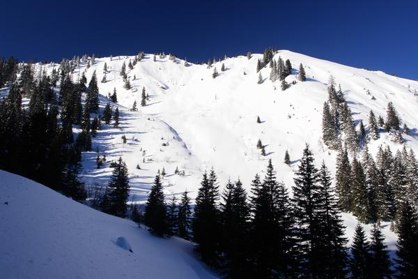 ... hier konnte ich schon einige große Lawinenausläufer beobachten, die über den Graben des Ahornkoglbach herüber gekommen sind.