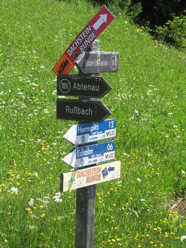 | Die Dachstein-Runde ist durchgängig gut beschildert - im Uhrzeigersinn (meine Route) gelb - in die andere Richtung rot - aber so steil wie das rote Schild vermuten läßt, war es nirgends |