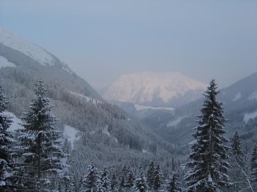 | Unterwegs zur Schladminger Alm. Blick aus dem Sattental hinaus nach Norden zum Kammspitz - einem der Gröbminger Hausberge. In der Früh ist es noch wolkenlos, aber dunstig. |