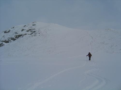 | Abfahrt vom Schidepot wenige Höhenmeter unter dem Gipfel. Fast direkt hinter Ingrid kann man unsere Aufstiegsspuren über den sehr steilen und teilweise abgeblasenen Gipfelaufbau erkennen. |