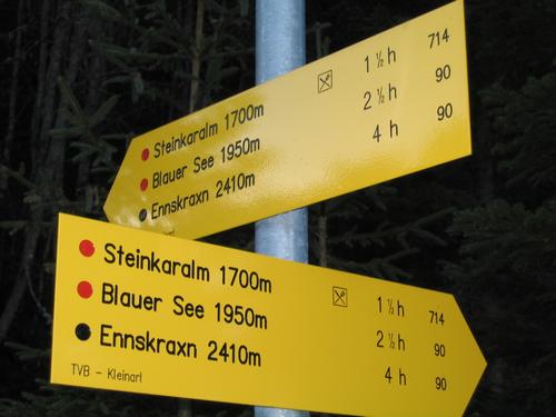 | Ab Kleinarl ist die Ennskraxen mit 5 Stunden angeschrieben - meines Erachtens eine sehr großzügige Vorgabe. An dieser Stelle teilt sich der Weg => geradeaus geht es kürzer durch den Wald - der rechte Weg führt zur Forststraße, die bis zur Steinkaralm hinaufzieht (Kinderwagengelände). |