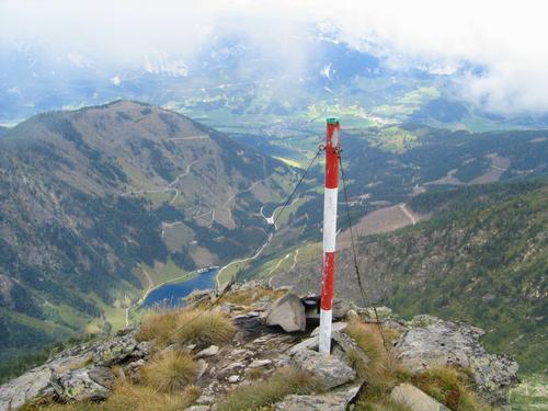 | Gipfelstange am Vockentalspitz mit Tiefblick zum steirischen Bodensee. |