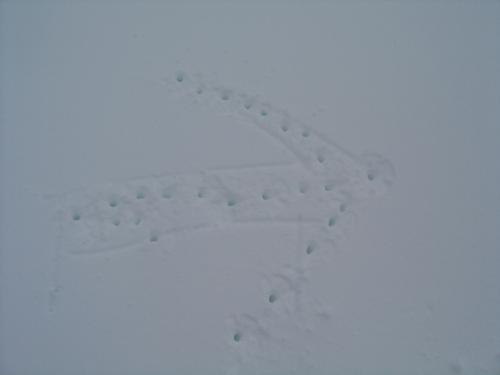 | Damit Alex, der einige Meter hinter mir geht, bei dieser Kreuzung den richtigen Weiterweg findet, habe ich eine Markierung im Schnee hinterlassen. Ich habe kurz überlegt, sie etwas bunter (z.B. gelb) zu gestalten, aber ich war zu ausgetrocknet. |