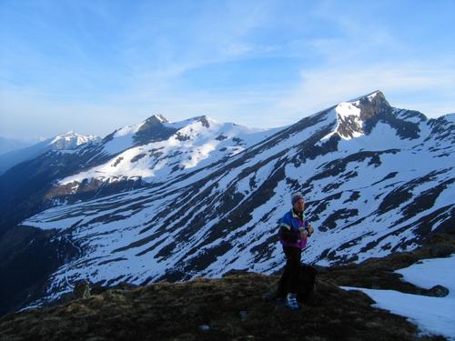 | Nach der Steilhangquerung: Erleichterter Blick Richtung Norden zum Schafdach (rechts) - Helmut gönnt sich einen Schluck |