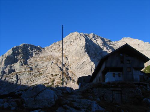 | Bei der Heßhütte auf 1.699 Meter Höhe. Schaut die Schmalseite noch ganz passabel aus, so wirkt die "häßliche" Breitseite der Hütte wie ein unformiger Klotz (128 Schlafplätze). Fast 700 Höhenmeter sind es noch bis zu unserem Ziel im Hintergrund - das Hochtor. |