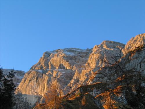 Blick vom Purtschellerhaus zur morgensonnebeschienenen Ostwand des Hohen Göll