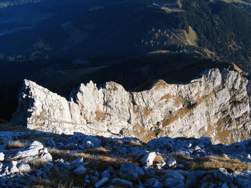 | Blick zurück zum Grat vom Purtschellerhaus herauf - der Weg führt zuerst auf der nicht einsehbaren (schattigen) Seite und später in der Sonne entlang des im Bild erkennbaren Grasbandes |