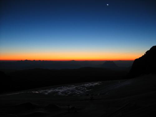 | Um 05:30 Uhr warten bereits Dutzende Frühaufsteher am Hunerkogel - die jüngsten erst wenige Wochen alt - in Erwartung eines traumhaften Sonnenaufganges. Vorne glänzt der Schladminger Gletscher im Dämmerungslicht. Am oberen Bildrand leuchtet die schmale Mondsichel. |