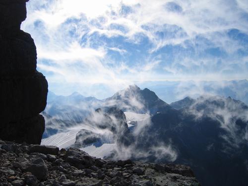Der Wind peitscht die Wolkenfetzen vom Norden über den Gipfel die Südwand hinunter