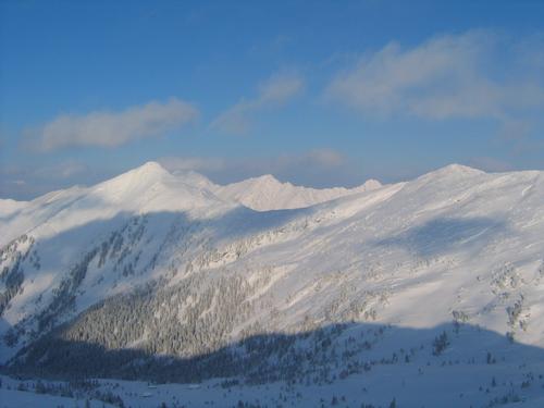 Noch einmal ein Blick zu Schoberspitze (links) - Hochrettelstein (Bildmitte) und Karlspitze (rechts - ebenfalls ein Schneeschuhziel am 30.04.2005).
