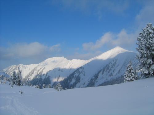 Nordöstlich der Michelirling Alm liegen Tattermann (links) und Schoberspitze (rechts - Schneeschuhtour am 30.04.2005).