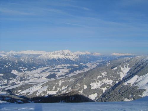 Tiefblick ins Ennstal mit dem Grimming in Bildmitte. Links dahinter das Tote Gebirge - rechts im Hintergrund die Ennstaler Alpen