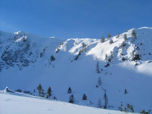 Die steile Ostflanke am Pleschnitzzinken - weiter links (im Bild nicht ersichtlich) sind 2 Schneebretter über ca. 150 Meter abgegangen