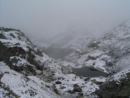 Blick zurück zum Brettersee (hinten) - links der Bildmitte kann man gut den sich entlang der Felswand schlängelnden Weg erkennen |
